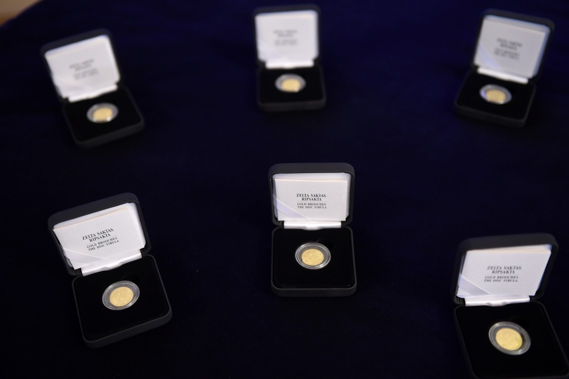 Ceturtdien monēta tika prezentēta. LB vadītājs Ilmārs Rimšēvics uzsvēra, ka Latvijas rotāšanas un dāvanu Latvijai veidošanas ietvaros Latvijas Banka kopā ar Latvijas māksliniekiem radīs vairākus veltījumus monētu mākslā, no kuriem īpaši minamas divas programmas – trīs zelta kolekcijas monētas monētu sērijā Zelta saktas un četras Latvijas kultūrvēsturiskajiem apgabaliem veltītas 2 eiro piemiņas monētas, kas iznāks 2016.–2018. gadā.