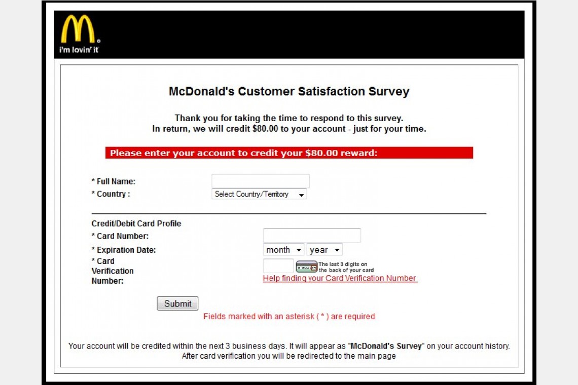 Vēstules ar piedāvājumu piedalīties aptaujā par apmierinātību ar sabiedriskās ēdināšanas tīkla McDonald's darba kvalitāti sāka pienākt 5. septembrī. Pēc atbildēšanas uz aptaujas jautājumiem lietotājs nonāk citā formā, kurā ir jānorāda savas kredītkartes numurs, tās derīguma termiņš un CVV kods, lai saņemtu 80 ASV dolārus lielu atlīdzību. Pēc tam upuris tiek novirzīts uz McDonald's oficiālo mājaslapu, bet maksājumu kartes dati nonāk pie hakeriem.