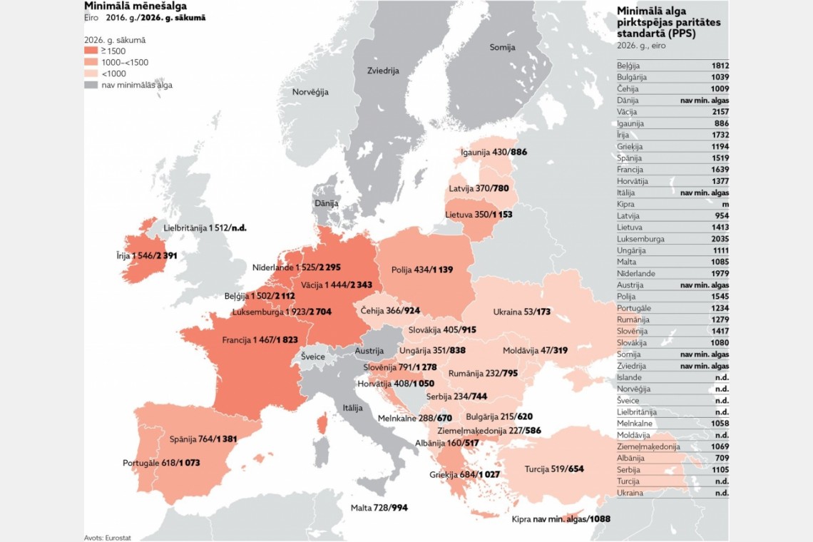 Latvijas minimālā mēnešalga 2026. gadā Eiropas Savienības valstu vidū ir zemākajā minimālo algu grupā, kas nepārsniedz 1000 eiro mēnesī, liecina Eurostat jaunākie dati. Pēc pirktspējas paritātes standarta ir vēl sliktāk – aiz mums tikai Igaunija.