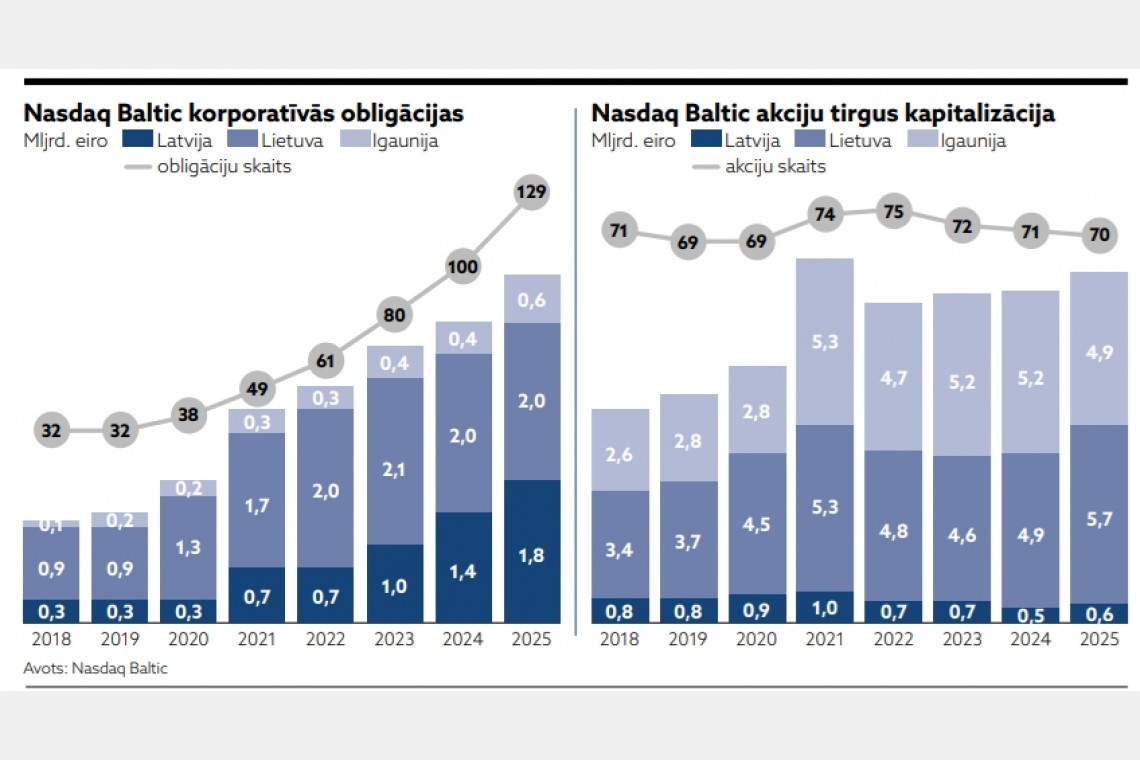 Igaunija (356 milj. eiro). 2025. gadā Baltijā obligācijas ir emitējis 121